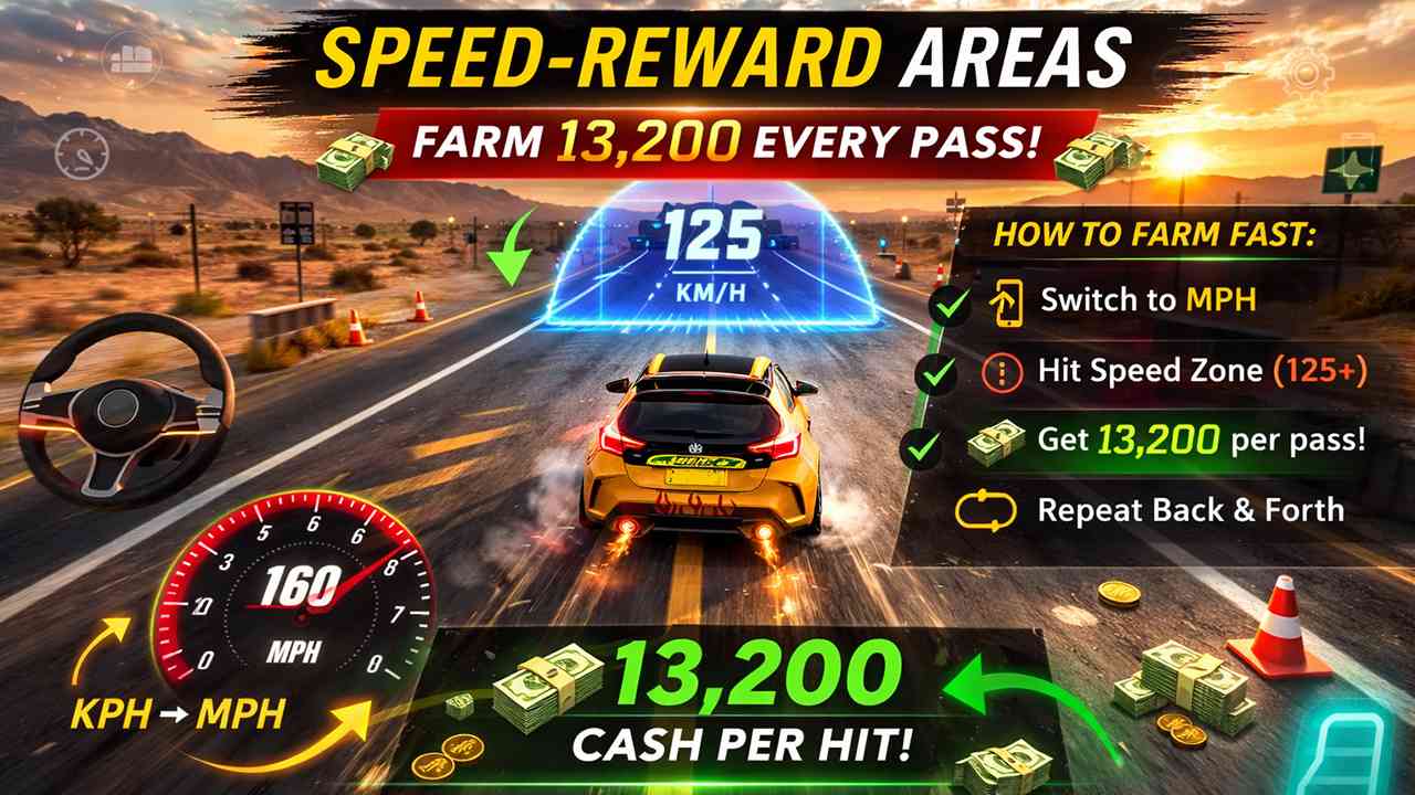The technique involves switching your speed unit from KPH to MPH and repeatedly passing through the speed zone. Each time you reach the required speed, you earn about 13,200 in-game currency.