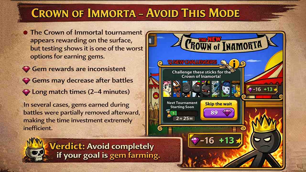 The Crown of Immortal tournament appears rewarding on the surface, but testing shows it is one of the worst options for earning gems.